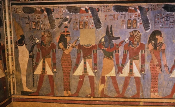 Väggmålningarna i det enorma utrymmet, med särskilt iögonfallande inslag av ljusblå färg, beskrivs som ”de mest utsökta” exemplen av sitt slag från Egyptens artonde dynasti.