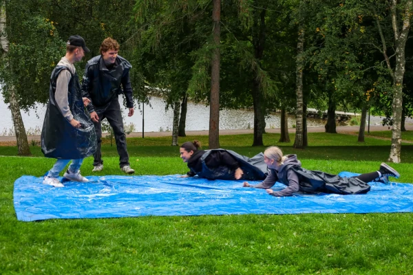 Dansgolvet, som bestod av en presenning med vatten och såpa, gav gulisarna oändliga möjligheter olika koreografier. Bild: Milja Ångerman
