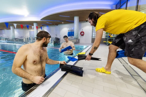 Under simträningen fick Johannes Björkqvist och Jonny Huggare Smeds testa på att simma med simfötter. Bild: Mikael Nybacka