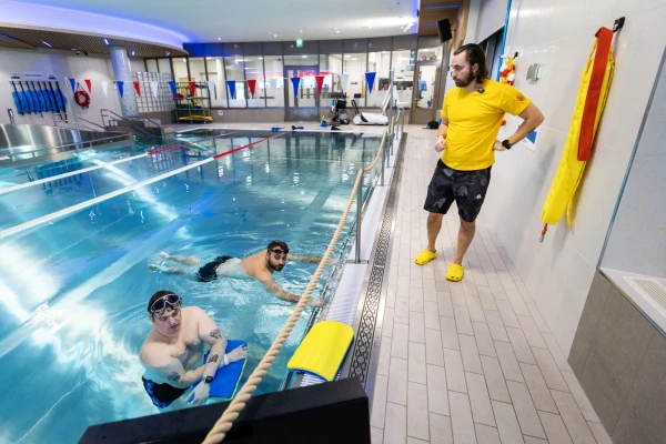 Med tanke på att simning är en skonsam träningsform passade det bra för Johannes skadade kropp. En månad efter samtalet står vi där, ombytta och redo att kasta sig i Korsholms pool. Vid bassängkanten väntar Emilio Lassfolk, rutinerad simlärare med erfarenhet från både Kristinestad och Smedsby.