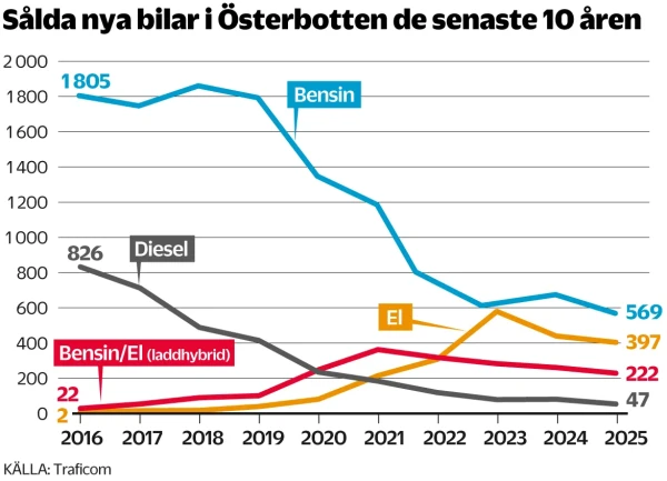 Av de 71 888 nyregistrerade bilarna år 2025 finns 1 236 av dem i Österbotten, enligt statistik från Traficom. Det kan jämföras med 1 919 stycken år 2020 och 2 456 år 2015.