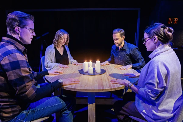 Två par som ska äta middag, men kvällen utvecklas till något helt annat. Skådespelarna är Jon Henriksen, Sonia Haga, Markus Lytts och Tove Qvickström. Bild: Frank A Unger