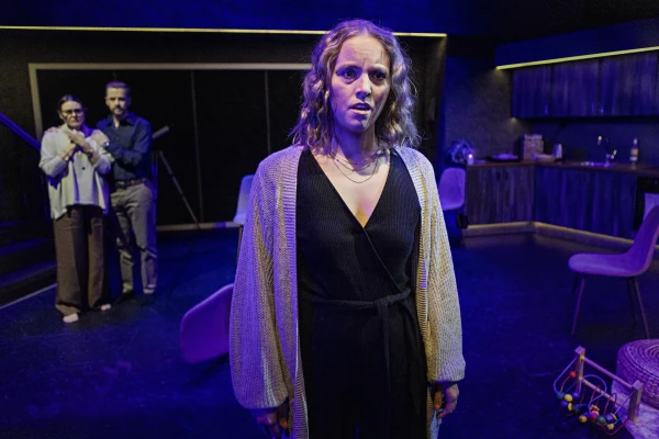 Sonia Haga spelar Jenny. Hon hör mystiska och skrämmande ljud varje natt, klockan 02:22. I bakgrunden står Laura och Benny, som spelas av Tove Qvickström och Markus Lytts. Bild: Frank A Unger