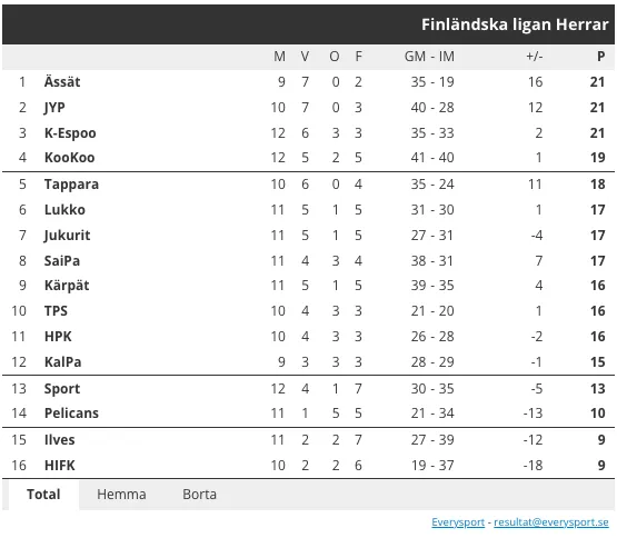- K-Espoo – Sport 3–4 (1–1, 1–2, 1–1)