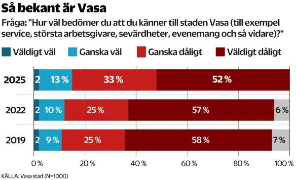 Medan det åren 2019 och 2022 endast var drygt 10 procent i åldersgruppen som sade sig känna till Vasa väl, var motsvarande siffra i år 23 procent.