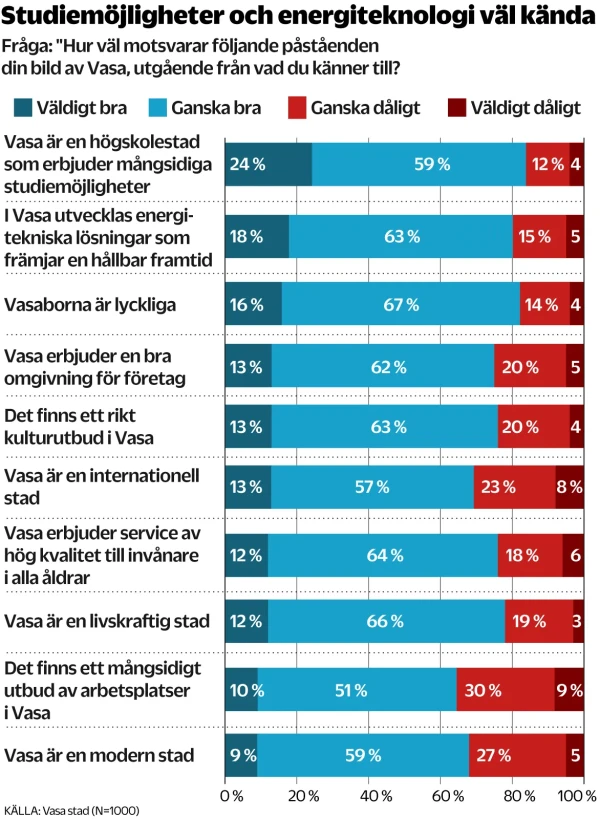Enligt undersökningen uppfattas Vasa som en havsnära studiestad med lyckliga invånare, och en plats för energiteknologisk kompetens.