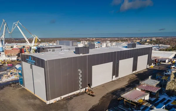 Med en kvarts miljon kubikmeter i volym är den nya hallen vid varvet avsedd att hålla byggandet av korvetterna dolt för nyfikna blickar. Pressbild. Bild: Rauma Marine Contructions