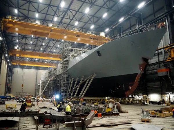 Samtidigt som nummer ett färdigställs pågår monteringen av skrovet på korvett nummer två inne i en enorm nybyggd hall ett stenkast från kajen. Här råder totalt fotograferingsförbud. Allt som inte syns utåt på fartyget är mer eller mindre topphemligt.