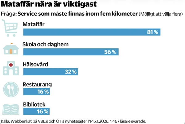 De flesta, över 80 procent, vill ha mataffären inom fem kilometers avstånd. Drygt hälften vill också att skola och daghem ska finnas inom samma radie.