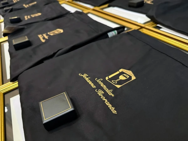 En guldnål, ett förkläde med namnbrodyr och ett diplom. De nya sommeliererna fick fina utmärkelser. Bild: Cecilia Holmström