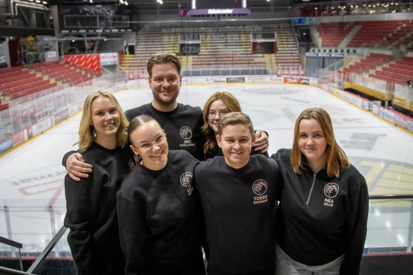 Herremännen i bakgrunden får tillfälligt ha skridskorna i omklädningsrummet när Pampasmaffian arrangerar fest för 34:e gången. Lotta Kumenius, Felicia Nylind, Linn Snickars, Todde Friberg, Mio Harju och Nea Olli ser fram emot att arrangera den största nationaldagen någonsin. Bild: Johannes Björkqvist