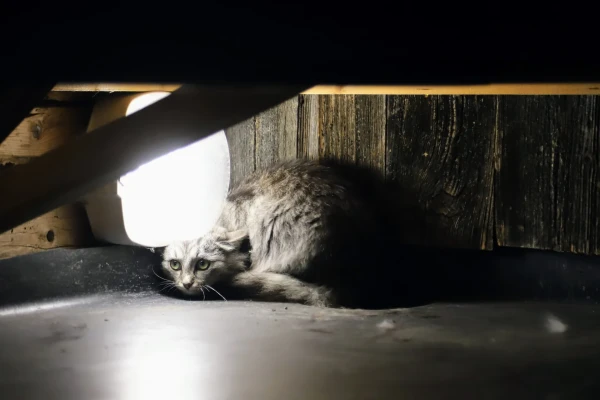 Det är ett hårt liv för vildkatter som måste klara sig på egen hand och på naturens villkor. Dessutom är de livrädda för människor. Den här har fått flytta in i bastustugan hos Elin Widlöf, i väntan på en ny familj. Bild: Heidi Kojonen