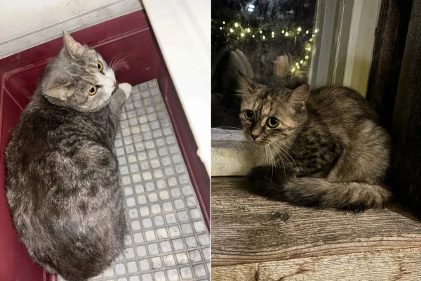 Två katter som söker nytt hem. Honorna är båda behandlade med medel mot löss, mask och öronskabb och ska steriliseras vecka 47. Bild: Elin Widlöf