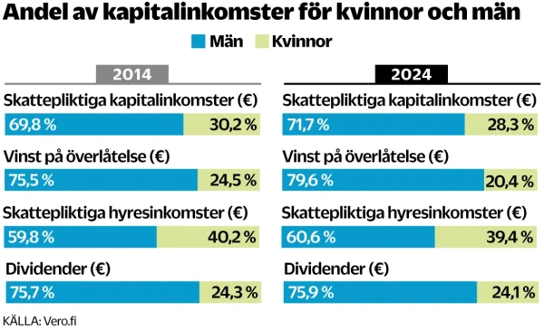 "Sett till beloppet är männens andel av dessa kapitalinkomster ännu större än sett till antal. Det berättar om att de genomsnittliga kapitalinkomsterna för män är större än för kvinnor", säger Luokkanen.