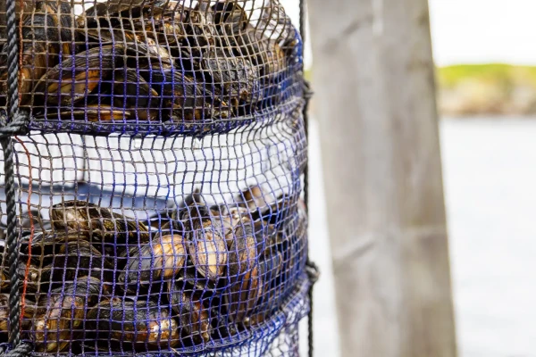 När musslorna är plockade läggs de i flytande sumpar i havet, förankrade så att de hänger från en boj.
